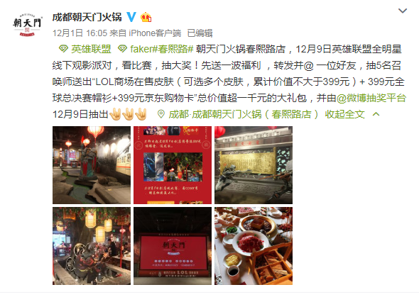 朝天門(mén)火鍋春熙路店,12月9日英雄聯(lián)盟全明星線下觀影派對(duì),看比賽,抽大獎(jiǎng)!先送一波福利 ,轉(zhuǎn)發(fā)并@ 一位好友,抽5名召喚師送出“LOL商場(chǎng)在售皮膚(可選多個(gè)皮膚,累計(jì)價(jià)值不大于399元)+ 399元全球總決賽帽衫+399元京東購(gòu)物卡”總價(jià)值超一千元的大禮包,并由@微博抽獎(jiǎng)平臺(tái) 12月9日抽出