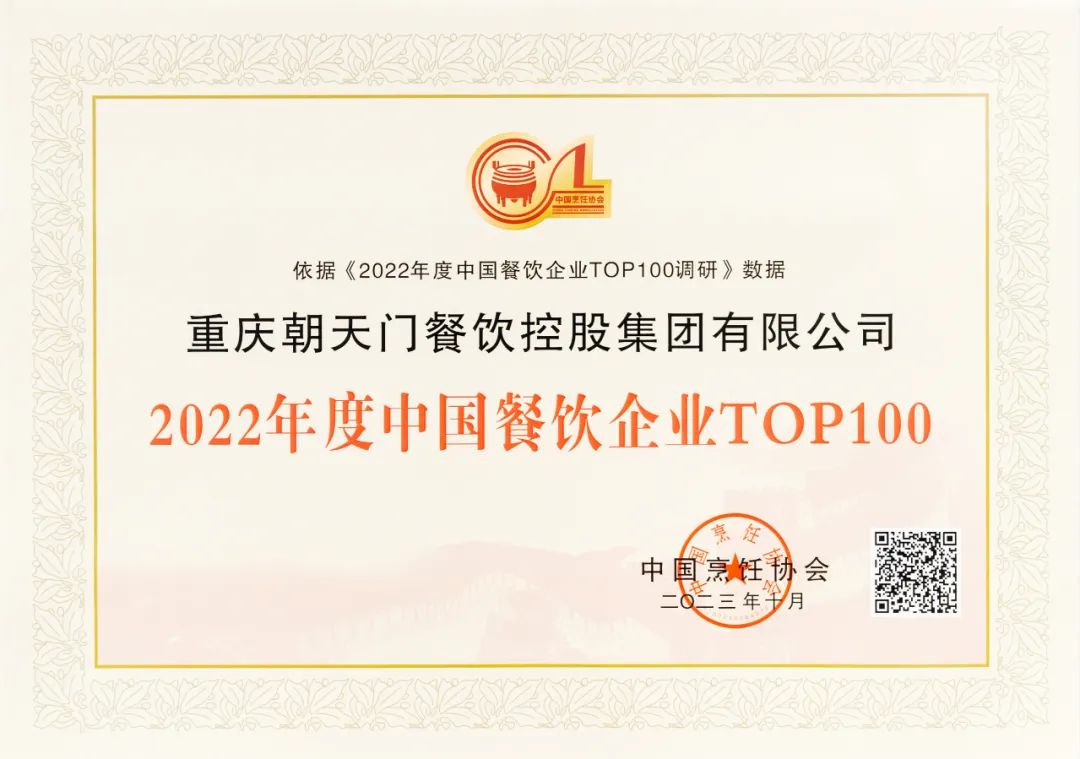 2022年度中國(guó)餐飲企業(yè)TOP100第七名,朝天門餐飲控股集團(tuán)連續(xù)11年獲此殊榮!